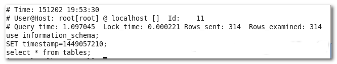 慢查询日志文件中记录了每一天慢查询记录,每一条记录都是以Time:开头;记录了包含登入信息,查询所花的时间,锁花的时间,返回的行数,扫描的记录数,执行的语句。