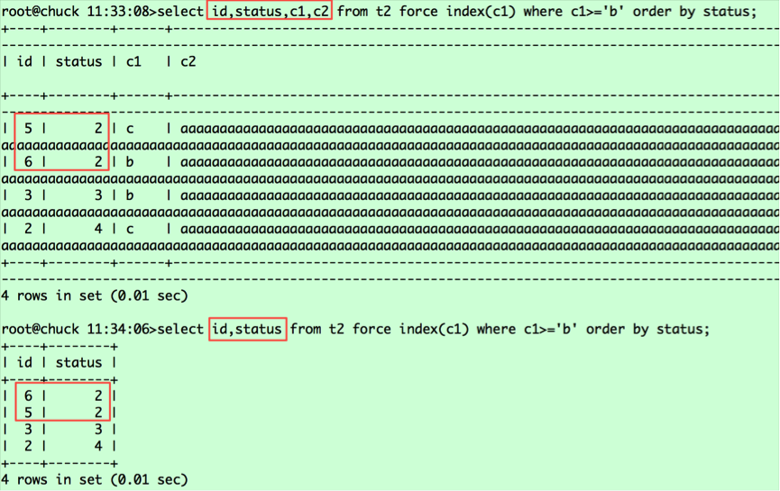 select id,status,c1,c2 from t2 force index(c1) where c1>='b' order by status; select id,status from t2 force index(c1) where c1>='b' order by status;
