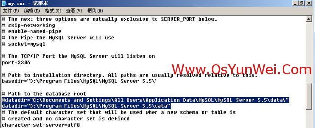 再下面添加一行datadir="D:\Program Files\MySQL\MySQL Server 5.5\data"