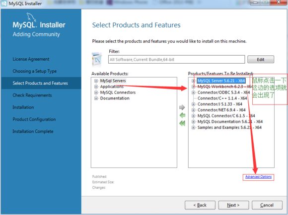 3、鼠标切到右侧项目 点击 mysql server 5.* 以后,右边下角才会出现这个选项,点击advanced options 就可以选择自定义路径了。