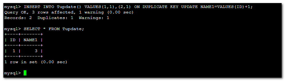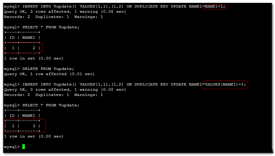 DROP TABLE IF EXISTS Tupdate; CREATE TABLE Tupdate (ID INT NOT NULL PRIMARY KEY , NAME1 INT UNIQUE KEY )default charset=utf8; INSERT INTO Tupdate() VALUES(1,1),(1,2) ON DUPLICATE KEY UPDATE NAME1=NAME1+1; INSERT INTO Tupdate() VALUES(1,1),(1,2) ON DUPLICATE KEY UPDATE NAME1=VALUES(NAME1)+1;