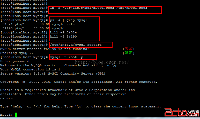 注:其实,这个问题很明显了,大家看Socket的参数,在/var/lib/mysql/mysql.sock中,而tcp协议要找的地址为tmp/mysql.sock,所以,我们要不然酱上面的sockket=/tmp/mysql.sock。当然我们都知道,其实,我们只需要软连接到tmp/mysql.sock中就可以了。