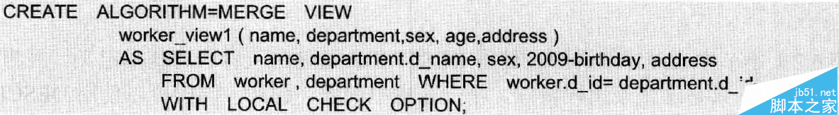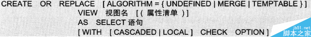 其中,Algorithm为视图选择的算法;属性清单指定了视图中各个属性的名词,默认情况下与Select语句中查询的属性相同;Select语句是一个完整的查询语句,表示从某个表中查出某些满足条件的记录并将这些记录导入到视图中;With Check Option表示更新视图时要保证在该视图的权限范围之内,CASCADED表示更新视图时要满足所有相关视图和表的条件,为默认值,Local表示更新视图时要满足该视图本身的定义即可;注意在使用创建视图时最好加上With Check Option,并选取默认的CASCADED参数。从而保证从视图派生出来的新视图在更新后可以考虑其父视图的约束条件,即更严谨。