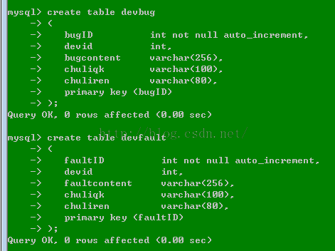 create table devbug ( bugID int not null auto_increment, devid int, bugcontent varchar(256), chuliqk varchar(100), chuliren varchar(80), primary key (bugID) ); create table devfault ( faultID int not null auto_increment, devid int, faultcontent varchar(256), chuliqk varchar(100), chuliren varchar(80), primary key (faultID) );