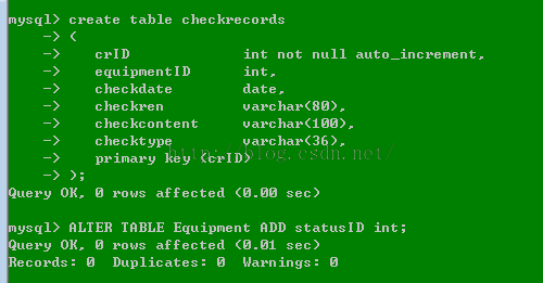 create table checkrecords ( crID int not null auto_increment, equipmentID int, checkdate date, checkren varchar(80), checkcontent varchar(100), checktype varchar(36), primary key (crID) ); ALTER TABLE Equipment ADD statusID int;