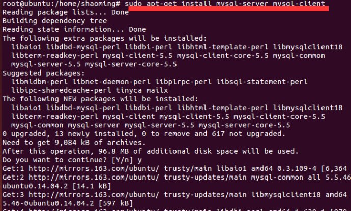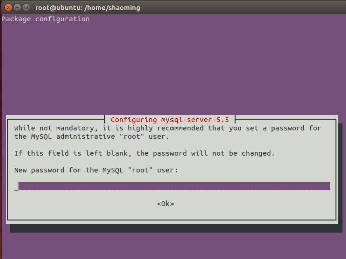 打开"终端窗口",输入"sudo apt-get install mysql-servermysql-client"-->回车-->输入"y"-->回车-->在"软件包设置对话框"中输入mysql中"root"用户的密码-->回车-->再输一次密码-->回车,安装完成。