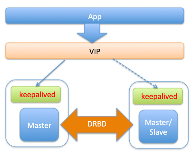 keepalived是一个HA软件,它的作用是检测服务器(web服务器,DB服务器等)状态,检查原理是模拟网络请求检测,检测方式包括HTTP_GET|SSL_GET|TCP_CHECK|SMTP_CHECK|MISC_CHECK等。对于DB服务器而言,主要就是IP,端口(TCP_CHECK),但这可能不够(比如DB服务器ReadOnly),因此keepalived也支持自定义脚本。keepalived通过监听来确认服务器的状态,如果发现服务器故障,则将故障服务器从系统中剔除。keepalived的高可用架构如下图,分别在主、从服务器上安装keepalived的软件,并配置同样的VIP,VIP层将真实IP屏蔽,应用服务器通过访问VIP来获取DB服务。当Master故障时,keepalived感知,并将Slave提升主,继续提供服务对应用层透明。