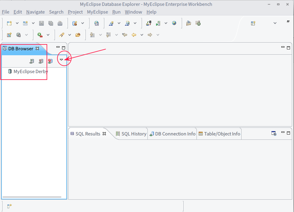 在DB Browser工作区间右侧有一个向下的三角形,如下图的红色箭头所指向的方向,点击出现下拉框。
