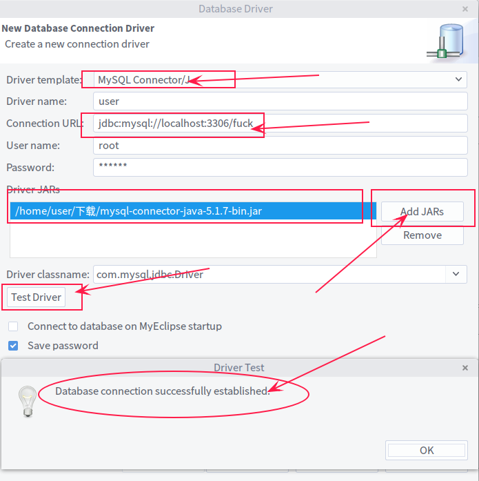 Add JARS---->选择第一步中下载保存的JAR文件路径---->Test Driver---->若成功则会出现如下的界面---->ok---->finish