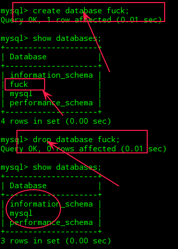 删除一个数据库命令:> drop database 数据库名称; (以下图片中以”fuck“这个数据库名称为实例)