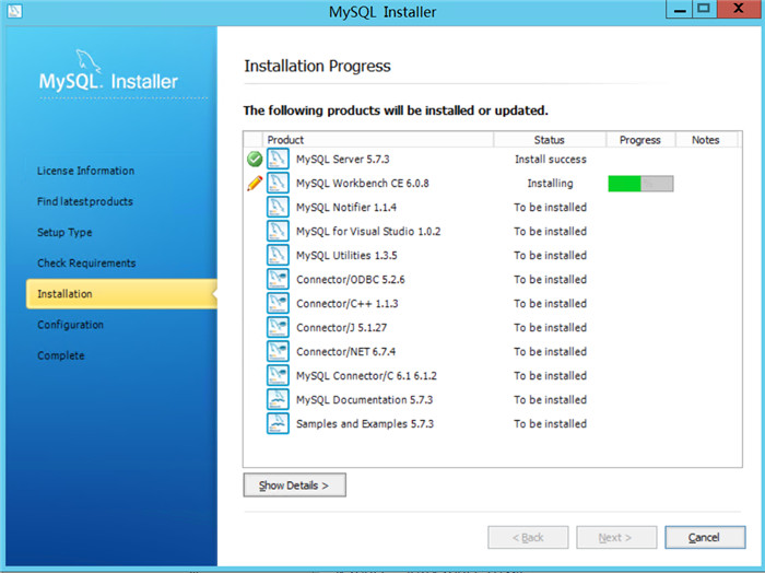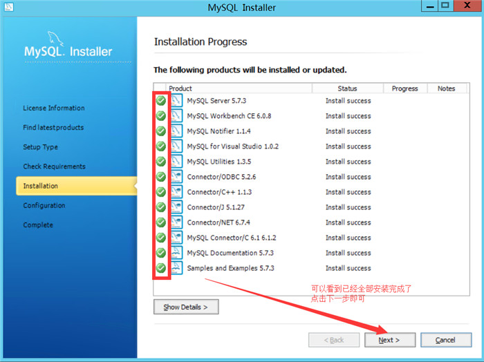 在需要的组件安装完毕后,MySQL便可以开始安装了。