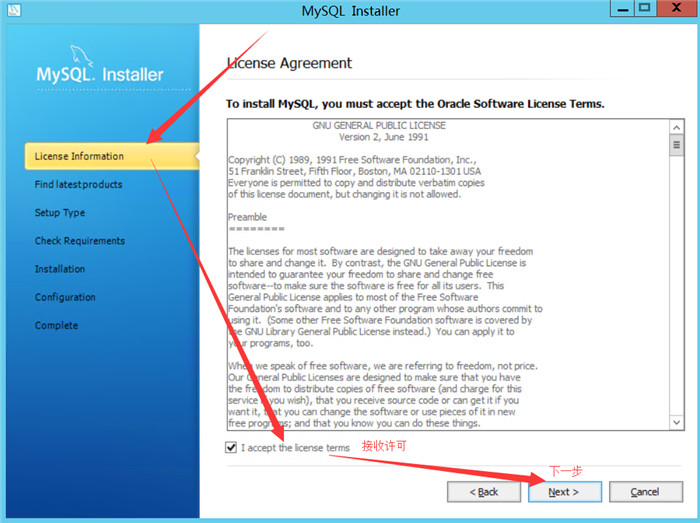 选择安装MySQL产品后,便打开了相应的许可协议窗口,阅读并接受许可后,点击Next下一步即可。