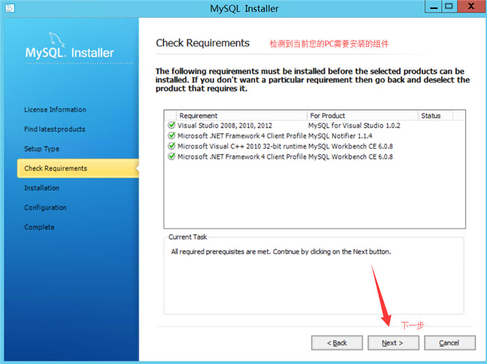 再开始安装之前,MySQL安装程序会检查当前您的PC中需要安装的组件,例如VC++运行库和.NET FCL等等。