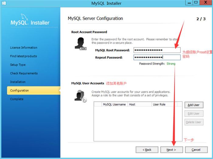 配置MySQL Server参数之后,下面就是设置MySQL的账户了。如图:
