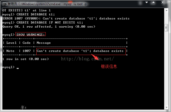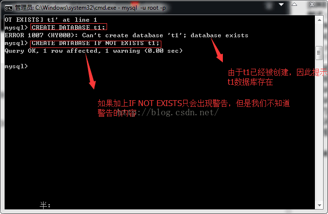 CREATE DATABASE t1; CREATE DATABASE IF NOT EXISTS t1;