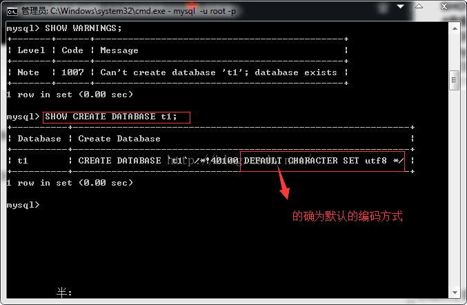 我们在创建数据库t1的过程中并没有指定数据库的编码方式,在此前的设置中我们修改了MySQL服务的默认编码方式,那么数据库t1到底是不是默认的UTF-8的编码方式呢?这就需要我们能查看数据的基本信息。
