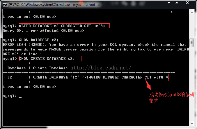 例子(修改我们刚才创建的数据库t2的编码格式为默认编码格式utg8):
