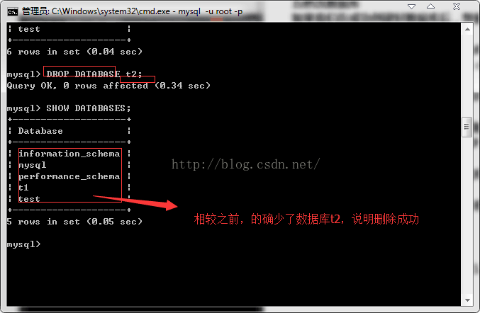 我们将创建的数据库t2删除,再次查看数据库列表