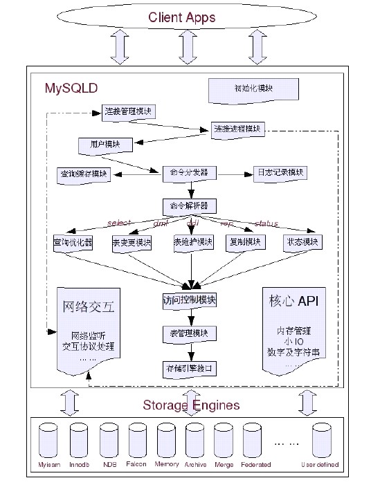 核心API 模块主要是为了提供一些需要非常高效的底层操作功能的优化实现,包括各种底层数据结构的实现,特殊算法的实现,字符串处理,数字处理等,小文件I/O,格式化输出,以及最重要的内存管理部分。核心API 模块的所有源代码都集中在mysys 和strings文件夹下面,有兴趣的读者可以研究研究。