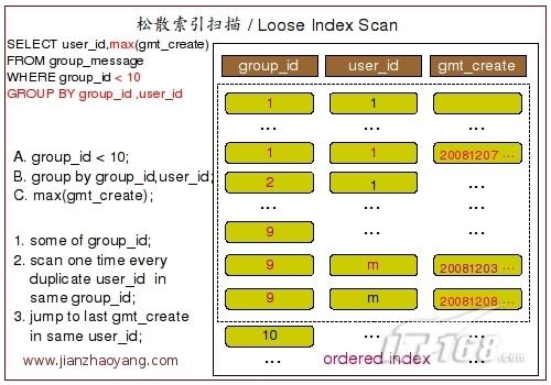 紧凑索引扫描实现 GROUP BY 和松散索引扫描的区别主要在于他需要在扫描索引的时候,读取所有满足条件的索引键,然后再根据读取恶的数据来完成 GROUP BY 操作得到相应结果。