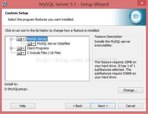 6、然后点击“Change”按钮,将安装路径改为:D:\MySQLsetup\;改完后的截图如下: