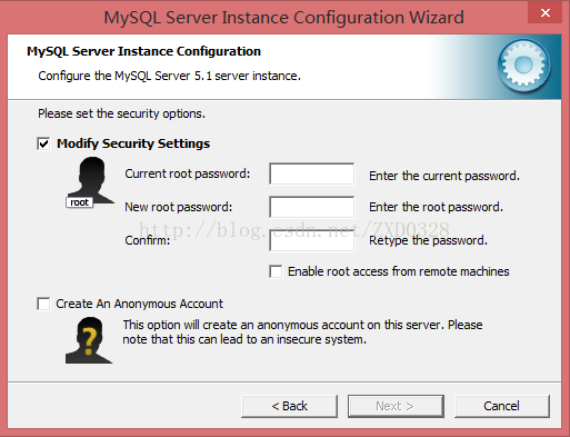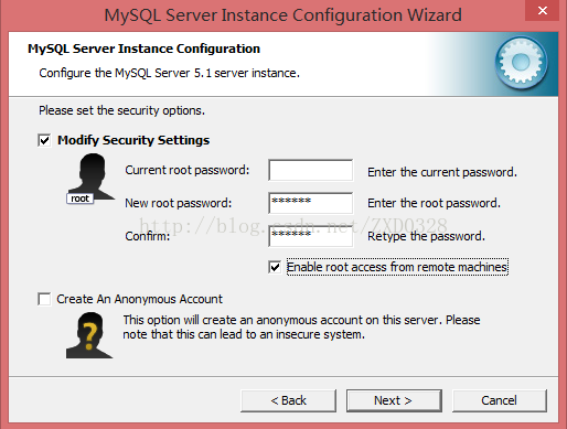19、在此界面设置root和密码,设置密码为“123456”(由于一开始安装没有设置密码,所以Current root password处不用填写),勾选“Enable...”然后界面如图所示: