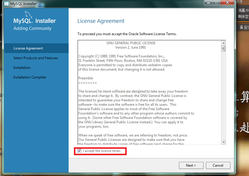 步骤2:单击图1.4中的“Install MySQL Products” 文字,会弹出的用户许可证协议窗口,如下图1.5所示。