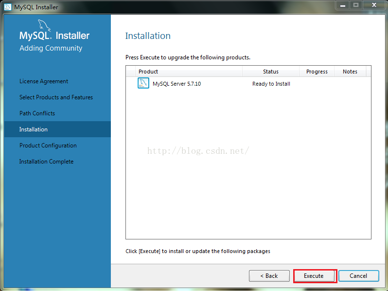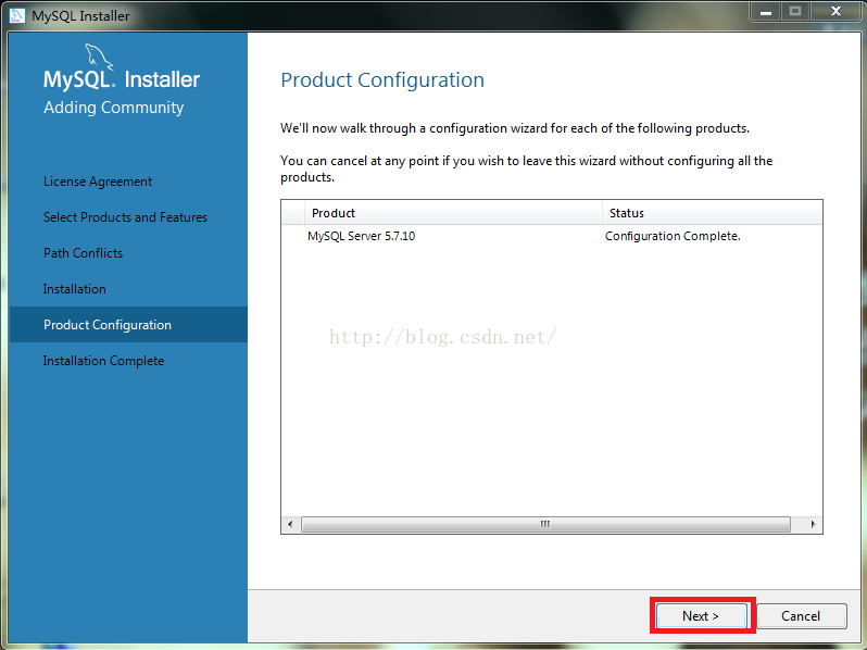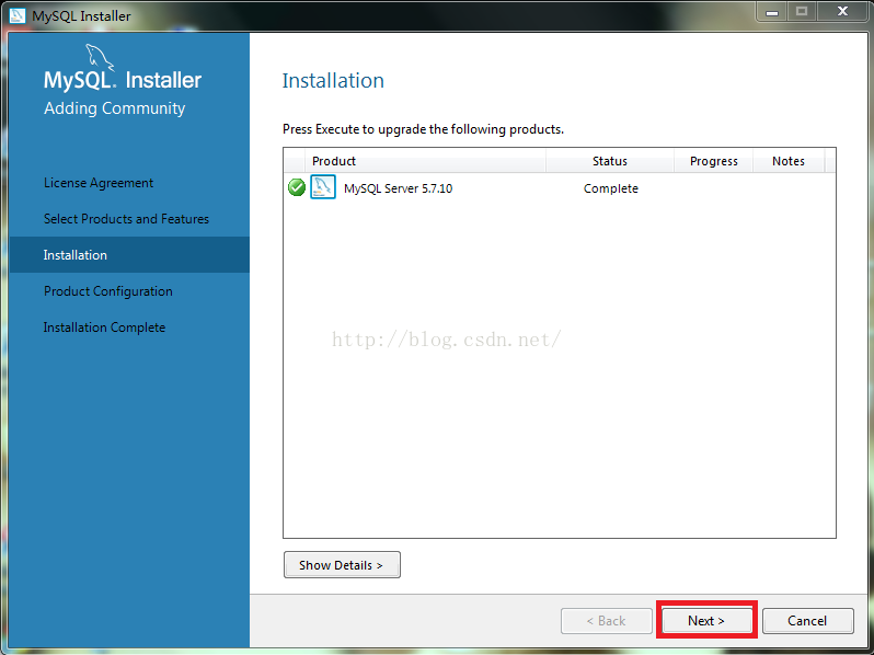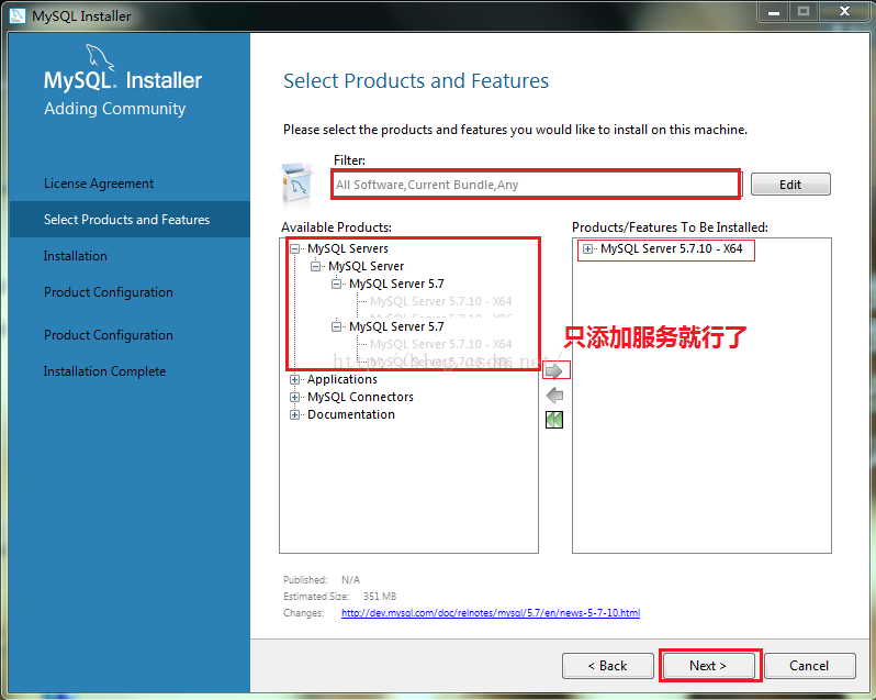 步骤4:单击Mysql Servers -> Mysql Servers ->Mysql Server 5.7 ->Mysql Server5.7.10 -64 ->添加到右边方框中 然后[Next]下一步 效果如下图1.7所示
