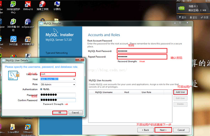 步骤9:在图2.1所对应的界面中,我们需要设置root用户的密码,在“MySQL Root password”(输入新密码)和“Repeat Password”(确认)两个编辑框内输入期望的密码。也可以单击下面的【Add User】按钮另行添加新的用户。效果如图左边所示 最后单击【Next】按钮,效果如下图2.2所示。