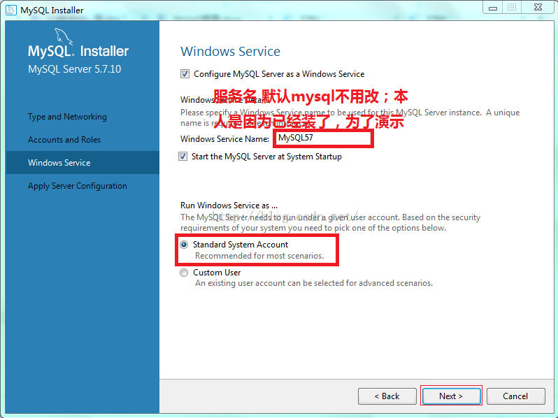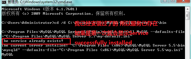 mysqld install MySQL --defaults-file="C:\Program Files\mysql\my-default.ini"