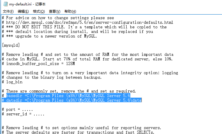 C:\Program Files (x86)\MySQL\MySQL Server 5.6\my-default.ini 打开该文件