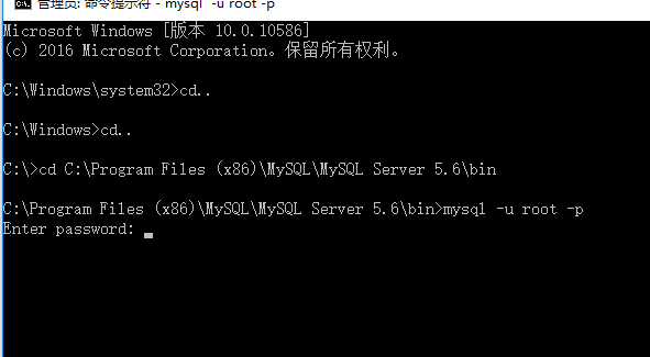 输入:cd C:\Program Files(x86)\MySQL\MySQL Server 5.6\bin 回车