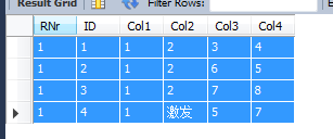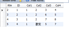 insert into test(Col1,Col2,Col3,Col4) values (1,2,3,4),(1,2,6,5),(1,2,7,8),(1,"激发",5,7); delimiter // select @row:=case when @row is null then 1 else @row+1 end as RNr, ID,Col1,Col2,Col3,Col4 from test ; // delimiter ;
