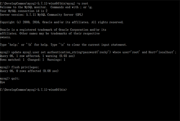update mysql.user set authentication_string=password('rocky') where user='root' and Host='localhost';