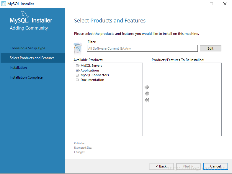 4. 在这里我们需要从安装程序提供的可安装的产品(Products)中选择我们需要的mysql server