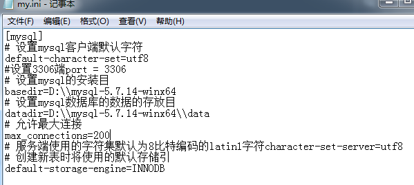 [mysql] # 设置mysql客户端默认字符 default-character-set=utf8 #设置3306端port = 3306 # 设置mysql的安装目 basedir=D:\\mysql-5.7.14-winx64 # 设置mysql数据库的数据的存放目 datadir=D:\\mysql-5.7.14-winx64\\data # 允许最大连接 max_connections=200 # 服务端使用的字符集默认为8比特编码的latin1字符character-set-server=utf8 # 创建新表时将使用的默认存储引 default-storage-engine=INNODB