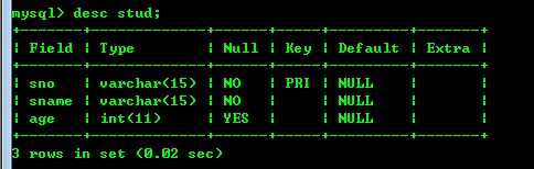 create table stud( sno varchar(15) not null primary key, sname varchar(15) not null, age int ); //创建一个表格stud,包含3列:sno,sname,age. not null —表示非null。 primary key —设置主键,也就是sno名字必须唯一!