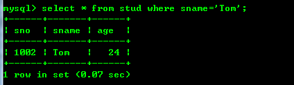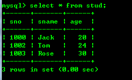 (这里是属于DDL的) insert into stud values(‘1000','Jack',20); insert into stud values(‘1002','Tom',24); insert into stud values(‘1003','Rose');//这句是错误的,不能少!(后面有指定插入哪几列的方法) insert into stud values(‘1003','Rose',30); 为stud表格增加一行并赋值