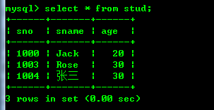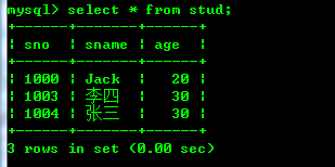 insert into stud values(‘1004','张三',30); //向stud 表插入一条记录