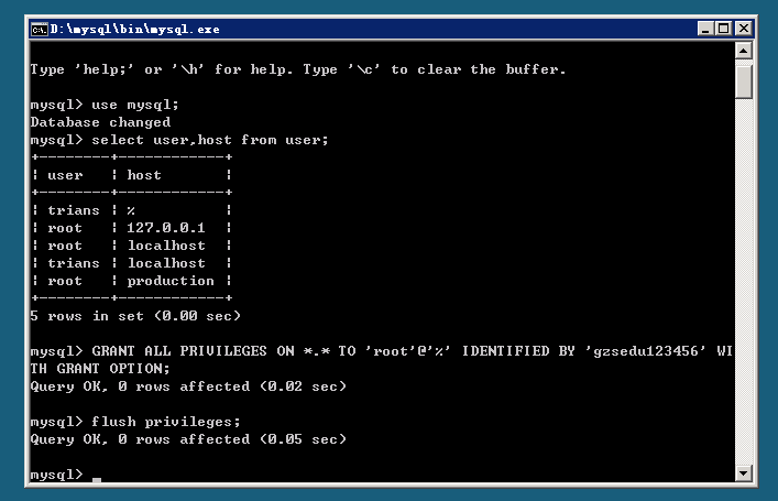 mysql> GRANT ALL PRIVILEGES ON *.* TO 'root'@'%' IDENTIFIED BY 'pwd' WITH GRANT OPTION; mysql> flush privileges;