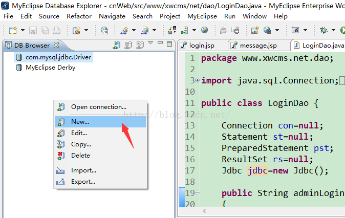 2.点击右上角的MyEclipse...在DB Browser空白处单击右键-->new 打开DataBase Driver