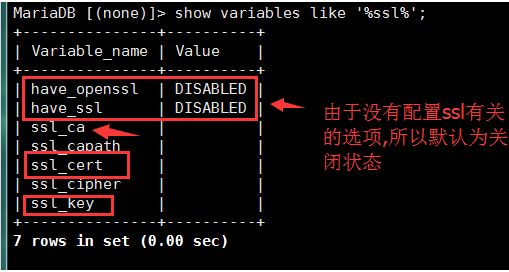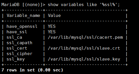 MariaDB [(none)]> show variables like ‘%ssl%';