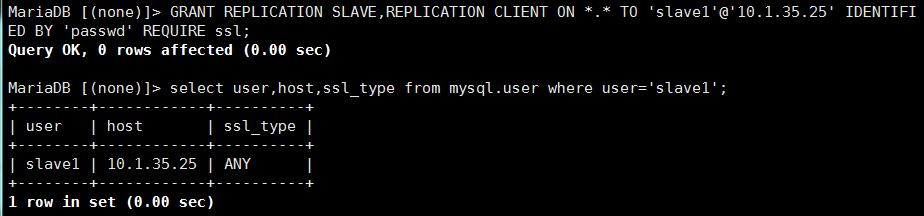 MariaDB [(none)]> GRANT REPLICATION SLAVE,REPLICATION CLIENT ON *.* TO ‘slave1'@'10.1.35.25' IDENTIFIED BY ‘passwd' REQUIRE ssl ;