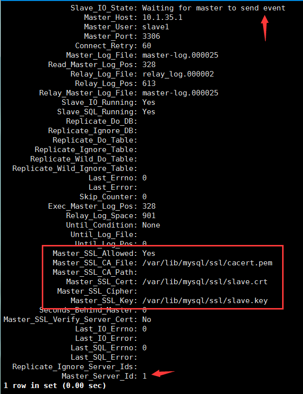 MariaDB [(none)]> CHANGE MASTER TO MASTER_HOST='10.1.35.1′,MASTER_USER='slave1′,MASTER_PASSWORD='passwd',MASTER_LOG_FILE=' master-log.000025 ‘,MASTER_LOG_POS= 245 , MASTER_SSL =1, MASTER_SSL_CA ='/var/lib/mysql/ssl/cacert.pem', MASTER_SSL_CERT ='/var/lib/mysql/ssl/slave.crt', MASTER_SSL_KEY ='/var/lib/mysql/ssl/slave.key';