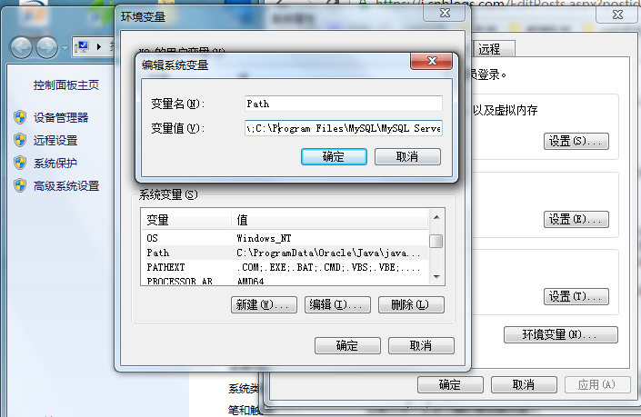 4、在最后添加 ";C:\Program Files\MySQL\MySQL Server 5.7",(C:\Program Files\MySQL\MySQL Server 5.7为mysql安装的根目录,如果安装时你有更改,则输入更改后的路径,注意根目录前面有个 ; )点击确定后再点确定,退出