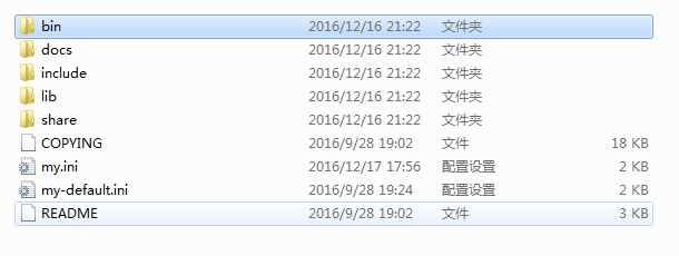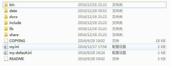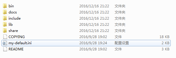 3、在当前目录下复制一份my-default.ini改名为my.ini ,此时的目录结构为