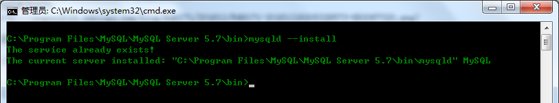 3、输入 "mysqld --install",回车,如下图(之前我已经注册过服务,所以会提示服务已经)