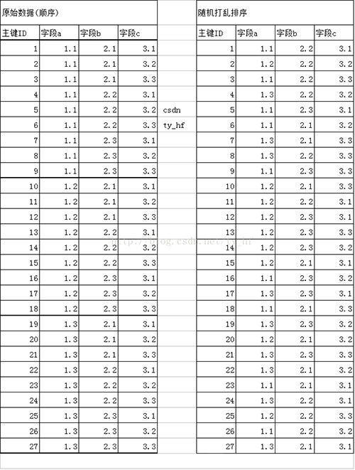 一.模拟创建原始数据 下图中,左边是自己方便说明,模拟的数据。引擎为mysiam~ 右边是用EXCEL把它们随机排列后的一个正常仿真数据表,把主键按照1-27再排列(不随机的话我在模拟数据时本来就是按顺序写的,再加索引看不大出这个索引排序的过程) 也就是说右边的数据,使我们要测试的原始数据,没建索引前是这样排序的,后边所有的数据都是以这个为依准进行的,这样更好看索引生成后的排序效果。 该表有4个字段(id,a,b,c),共21行数据