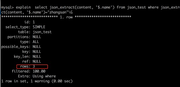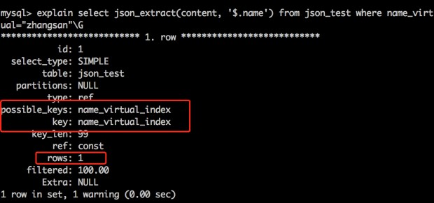explain select json_extract(content, '$.name' ) from json_test where name_virtual= "zhangsan" \G