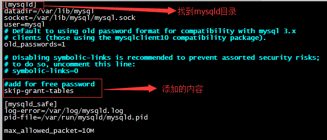 2.在[mysqld]下添加skip-grant-tables,然后保存并退出